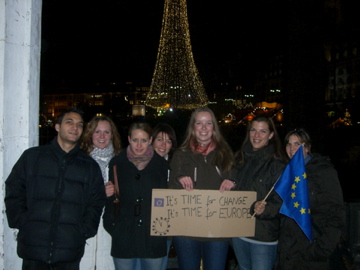 Von Hamburg aus starten knapp 20 Teilnehmer Richtung Dänemark, darunter Mitglieder der JEF- Hamburg und -Bremen sowie Vertreter der Jugendorganisationen der Parteien. In Kruså erwartete die Delegation dann eine bunt zusammengewürfelte deutsch-dänische Truppe: Mitglieder der schleswig-holsteinischen und Berliner Jugendverbände hatten sich bereits neben einer Gruppe der JEF-Dänemark postiert, schwenkten Fahnen und boten den zahlreichen Pressevertretern geradezu ein Musterbeispiel an europäischem Gemeinschaftsgeist. Insgesamt waren rund 170 Teilnehmer vor Ort, umringt von einigen Schaulustigen, die die Aktion aufmerksam verfolgten.